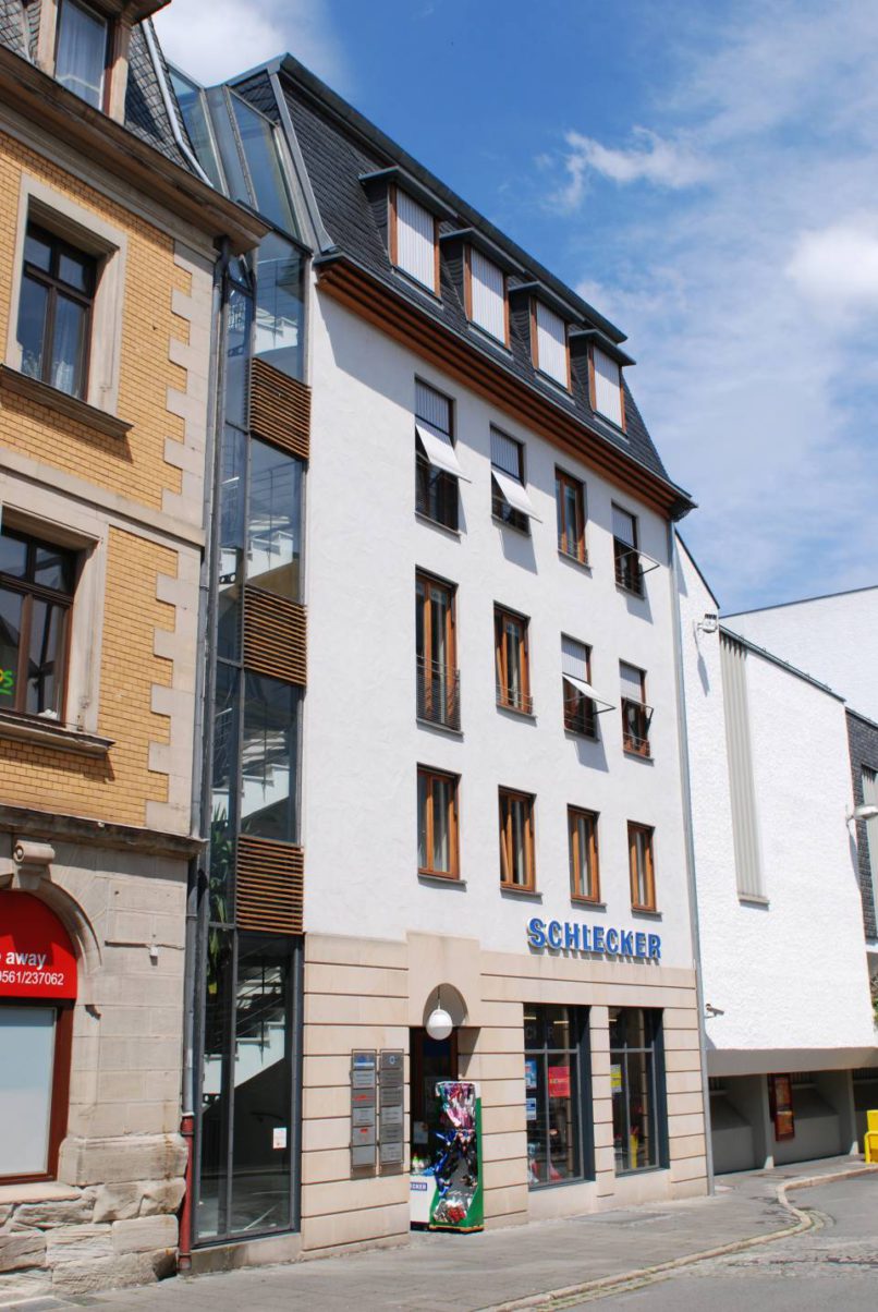 Neubau eines Wohn- und Geschäftshauses in eine innerstädtische Baulücke. Aufgabe war es, die Baulücke zwischen einem denkmalgeschützten Altbau und einem moderneren Parkhauskomplex qualitätvoll zu schließen.