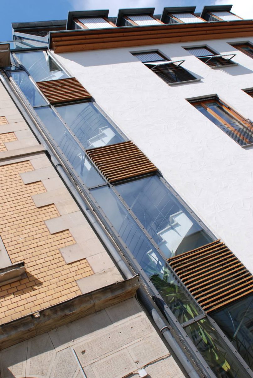 Die Stahl-Glas-Fuge fügt den historischen Altbau und den Neubau harmonisch zusammen und beherbergt gleichzeitig das Treppenhaus und den Aufzug für beide Gebäude.